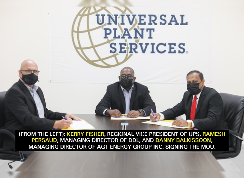 The MOU was signed by Kerry Fisher, Regional Vice President of UPS; Ramesh Persaud, Managing Director of Demerara Distillers Limited (DDL); and Danny Balkissoon, Managing Director of AGT Energy Group Inc. at DCEL’s Providence, East Bank Demerara office on Thursday last.