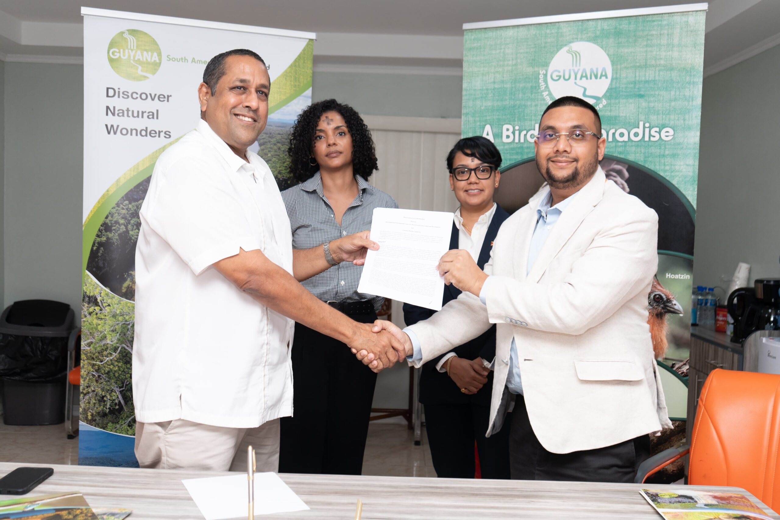 Director of the Guyana Tourism Authority, Kamrul Baksh and CEO of Iwokrama, Dane Gobin exchange signed copies in the presence of Minister of Tourism, Industry & Commerce, Hon. Susan Rodrigues and Iwokrama Special Projects Coordinator, AnneMarie Ford.
