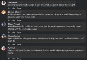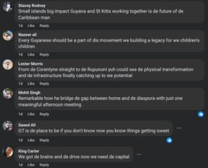 Some of the comments are even beginning to use some creole language. A February 27 post of the President meeting the Guyanese community in St. Kitts and Nevis shows comments like “We got de brains and de drive now we need de capital” and “Remarkable how he bridge de gap between de home and de diaspora with just one meaningful afternoon meeting”.